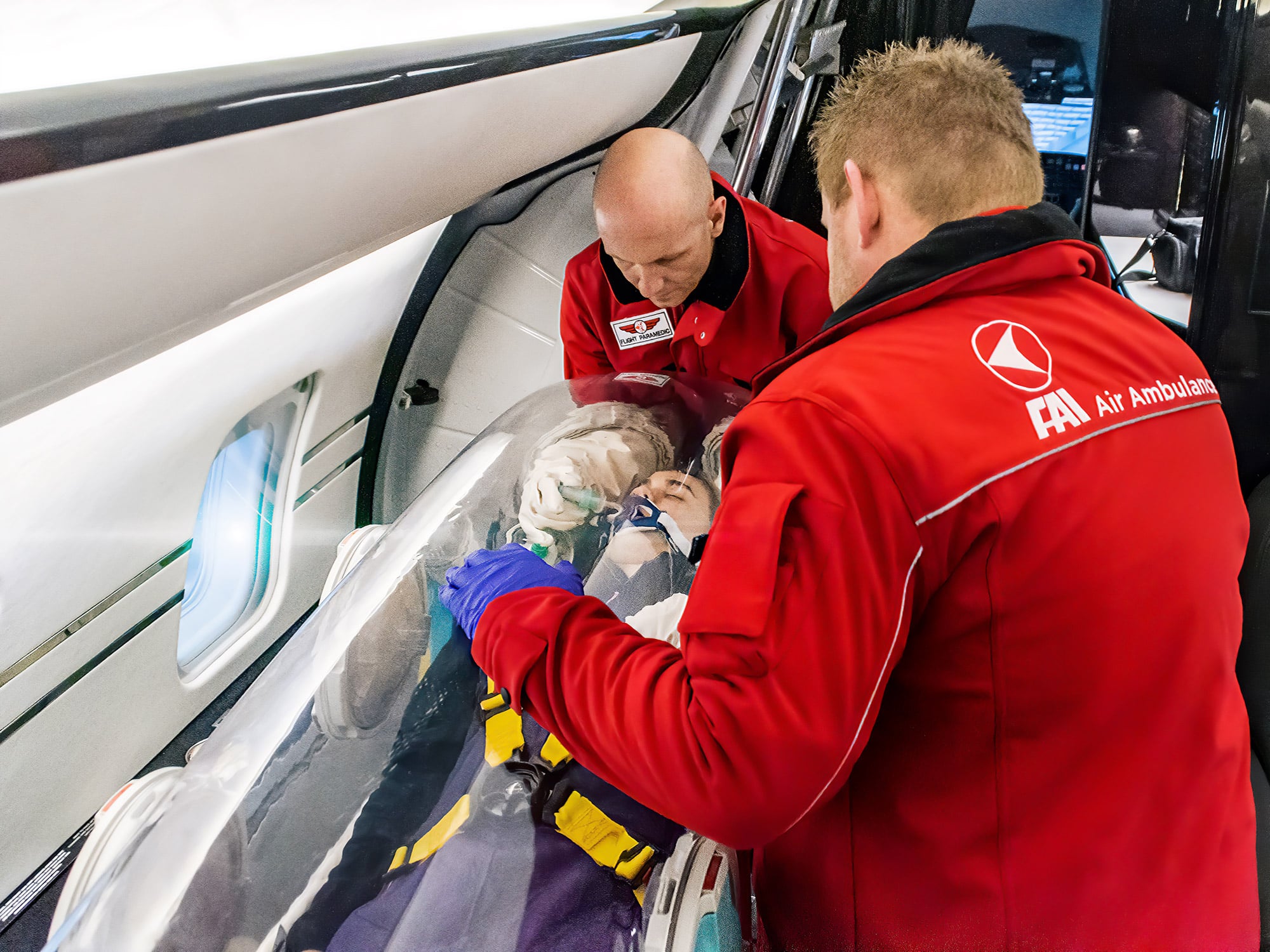 Dank langjähriger Erfahrung gewährleistet FAI die strikte Einhaltung höchster Sicherheitsstandards beim Transport von hochinfektiösen Patienten. Um die Verbreitung hochansteckender Krankheiten während des Transports zu verhindern und das unmittelbare Umfeld des Patienten zu schützen, werden moderne Portable Medical Isolation Units (PMIUs) vom Typ EpiShuttle und IsoArk eingesetzt.