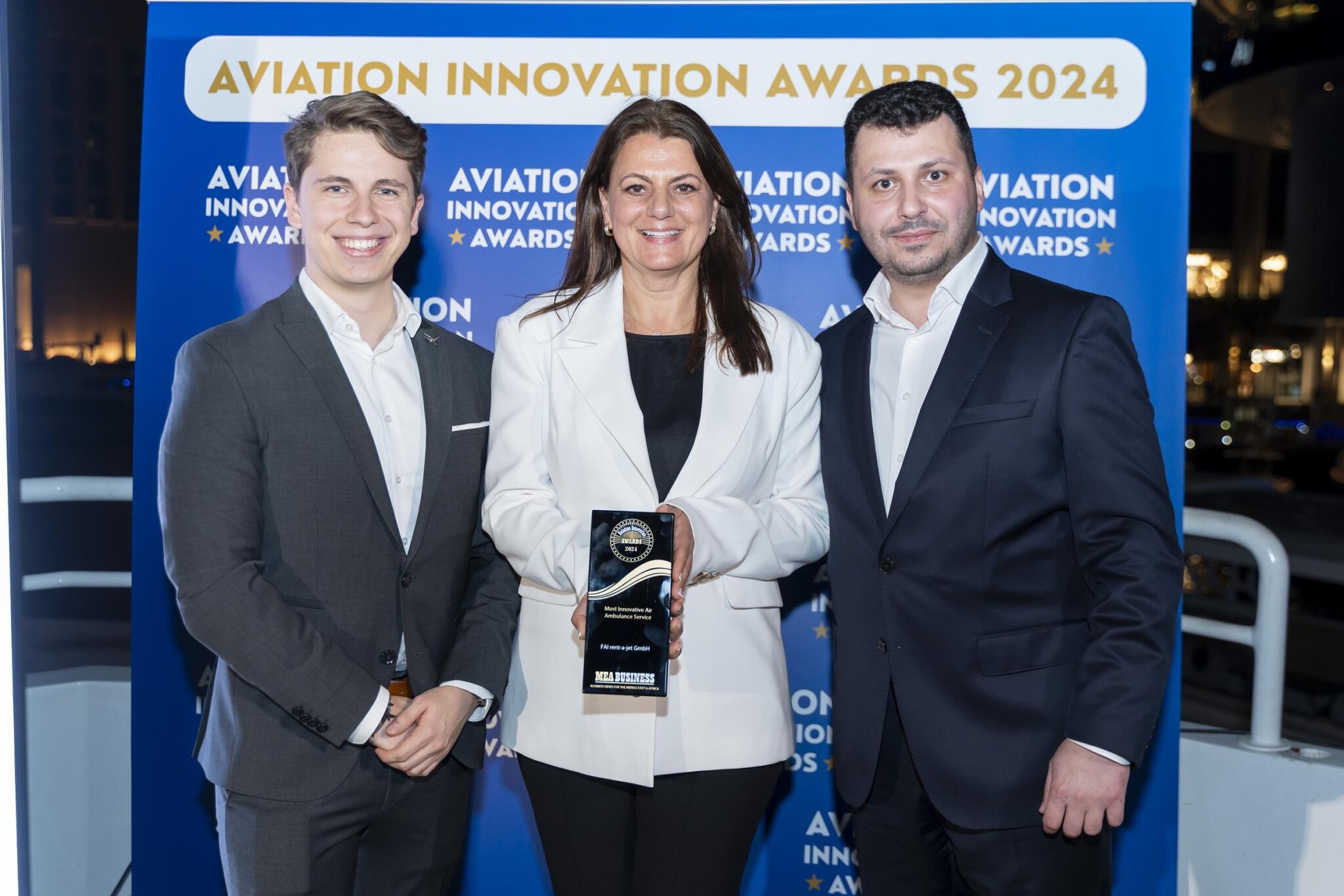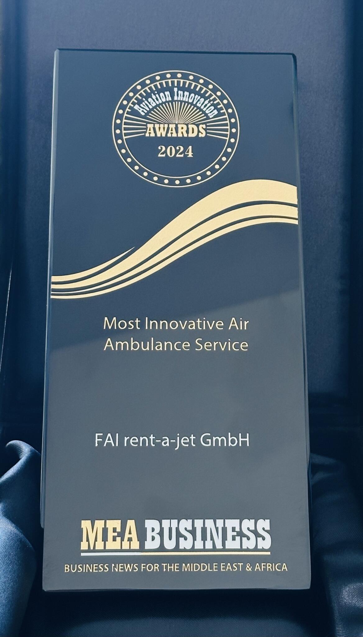 FAI rent-a-jet GmbH, Deutschlands führender, weltweit tätiger Anbieter für zeitkritische Luftfahrtdienstleistungen, wurde am 12. Dezember 2024 im Rahmen der Middle East Aviation Business Awards 2024 als „Innovativstes Ambulanzflug-Unternehmen“ ausgezeichnet. Die Preisverleihung fand zeitgleich mit der MEBAA-Messe in Dubai statt. Die Auszeichnung wurde der in Dubai ansässigen Geschäftsführerin Barbara Baumgartner von Kenneth Mitchen vom MEA Business Magazine während einer Gala überreicht, die von hochrangigen Führungskräften der Luftfahrtbranche besucht wurde.